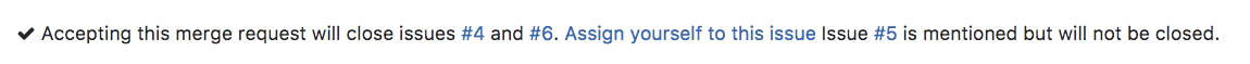 In this example, the keyword "closes" prefixing the issue number will create a relationship in such a way that the merge request will close the issue when merged.